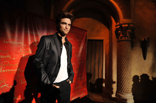 The fans pose for photographs with the wax figure of Robert Pattinson